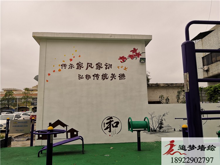 墻繪項目介紹:石排太和社區(qū)墻繪設計,運用國畫的繪畫風格體現(xiàn)中華的傳統(tǒng)美德,與社區(qū)環(huán)境完美融合,得到領導與社區(qū)民眾的的認可贊許,給追夢墻繪很大的鼓勵.