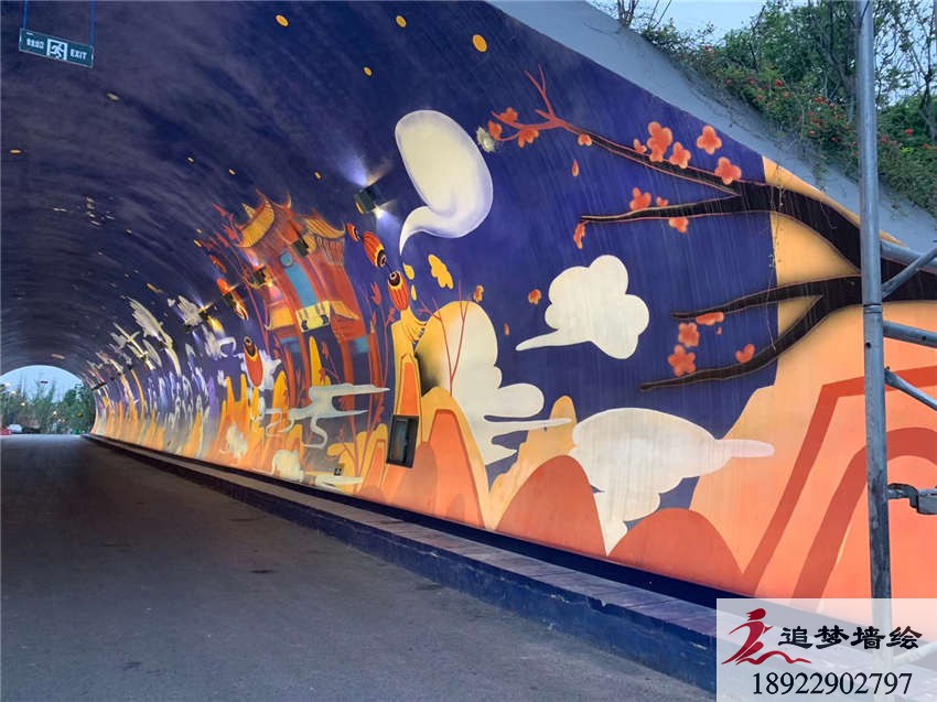 珠海隧道彩繪這個項目,我們追夢墻繪一起策劃,設計出比較夢幻的設計方案,以具有夢幻代表性的紫色色調為主,搭配橙色,用各種各樣夢幻的圖案,文字,把畫面做的精彩生動,色調明快,協調統一,仙鶴,云彩,熊貓等圖案都展示了夢幻的內涵!