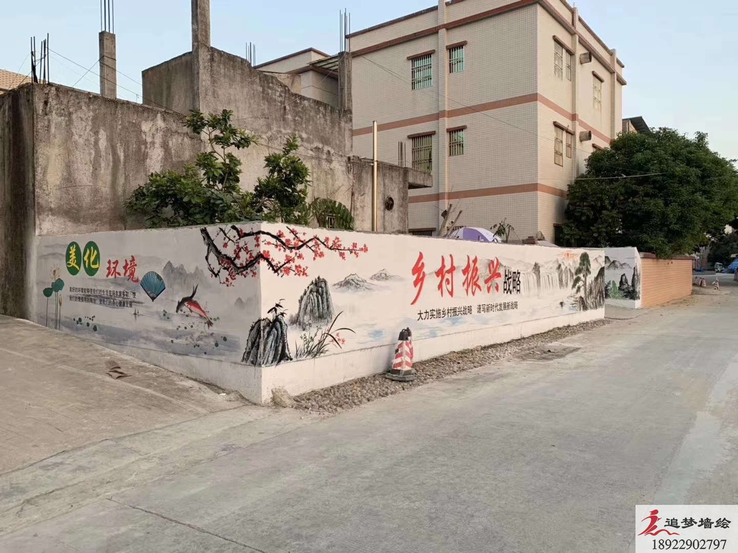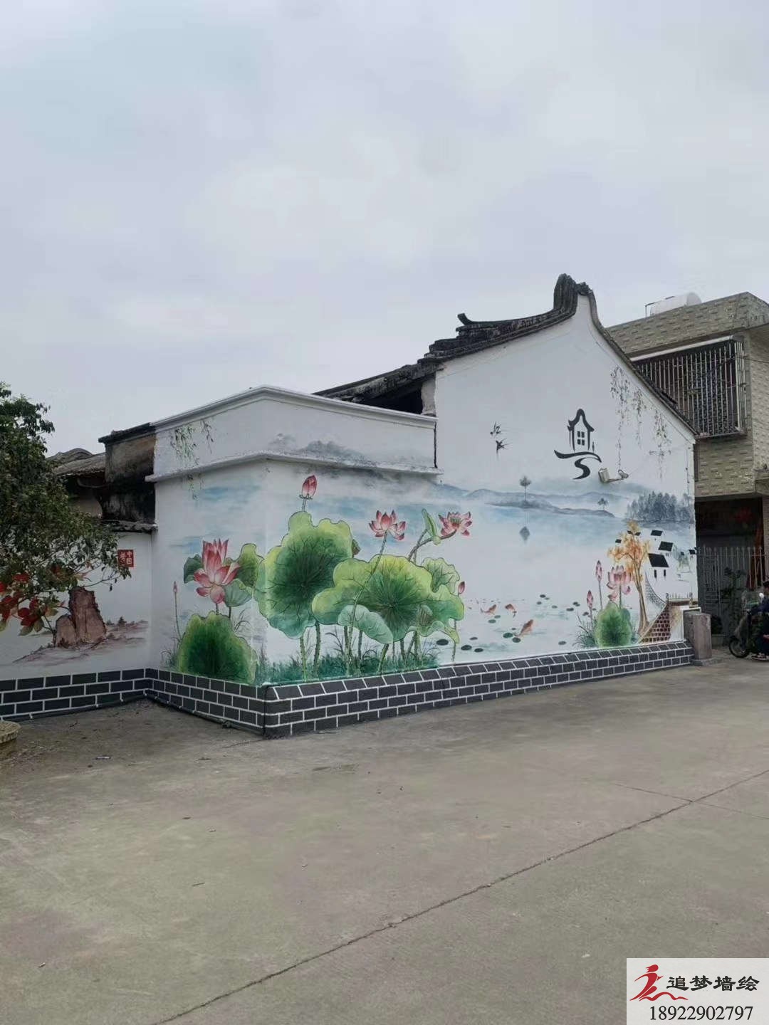 墻繪項目介紹:這次的項目主要繪制彩繪圖案整體設計圍繞鄉村振興戰略為主題,突出美化環境的主題。圖案是以鄉村氣氛為主的山水,荷花,采用圖文結合的表現形式,突出了自然。墻繪整體基調樂觀積極向上
